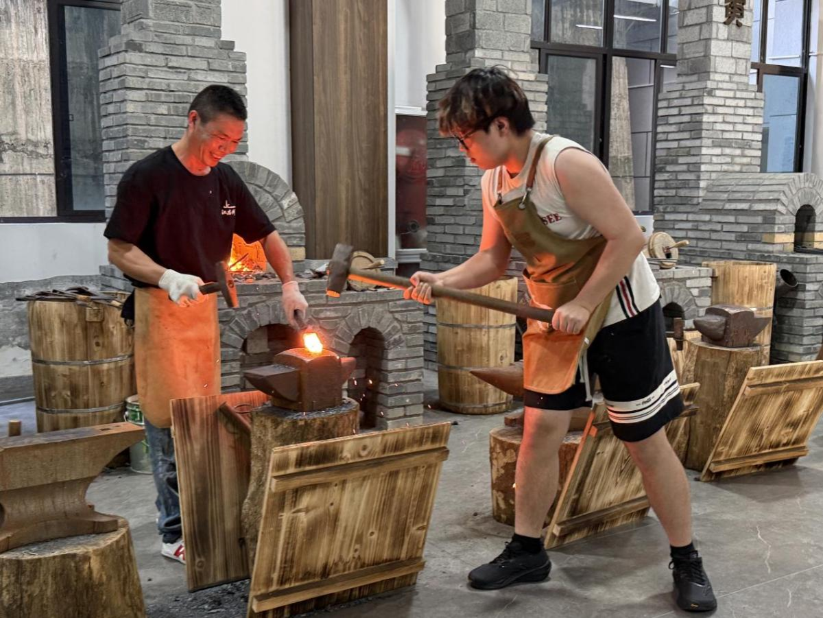 考察团通过手作实践深化非遗理解。在龙泉宝剑锻造坊,非遗传承人江龙演示“锻、磨、淬”百炼成剑的工艺,学生亲手参与剑坯锻打与打磨,体会“百炼钢化为绕指柔”的匠人精神。泉州非遗馆内,南音工坊的吟唱与提线木偶的灵动演绎,让学生感受非遗的活态传承;木偶戏传承人现场教授“提线控偶”技法,将机械传动原理与传统表演艺术巧妙结合。