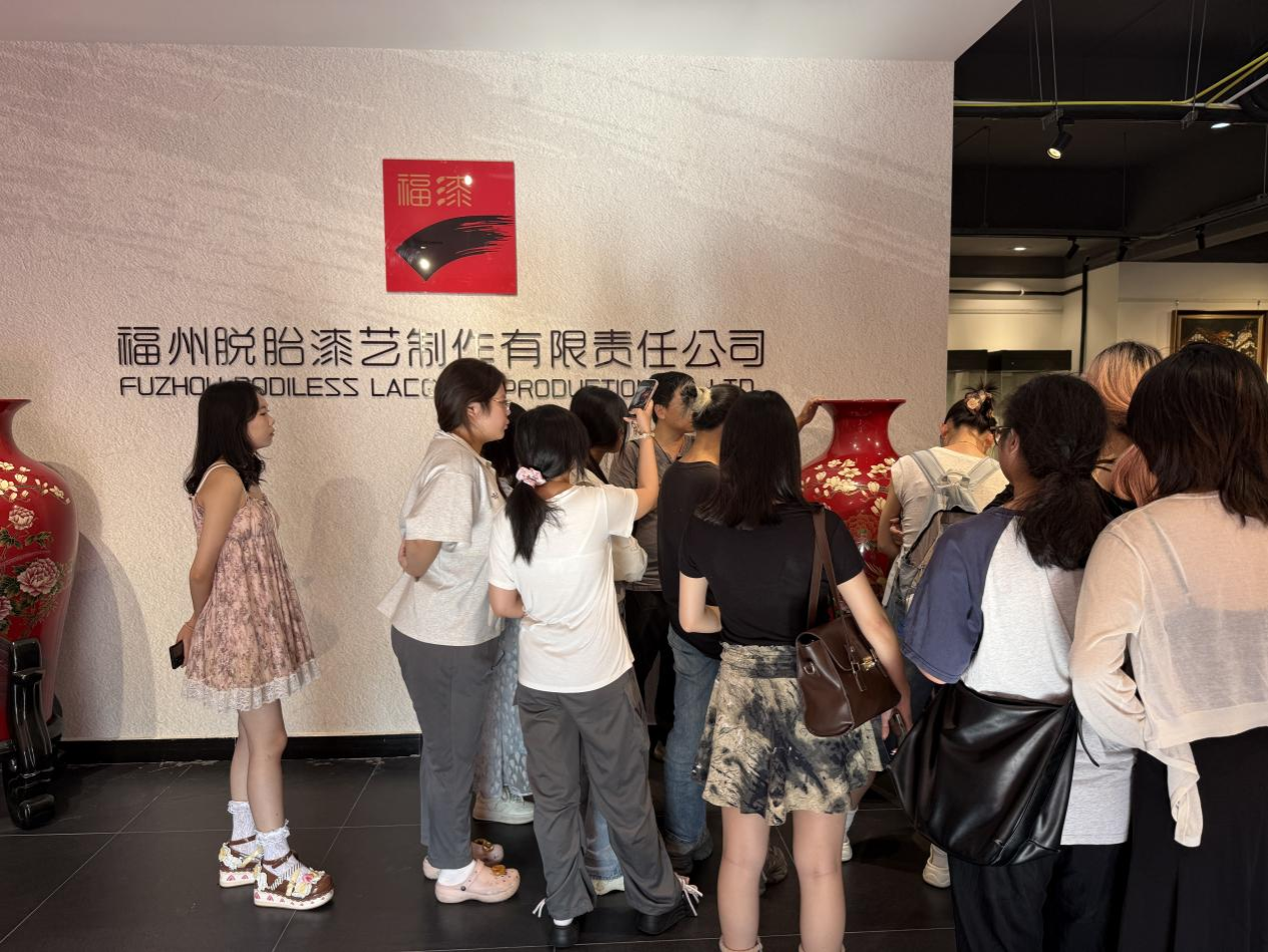 考察期间,师生与多位行业专家展开深度对话。中国美协漆画艺委会副主任汤志义以厦门漆画双年展为切入点,剖析漆画语言的当代转译策略;在福州大学厦门工艺美术学院,苏国伟教授分享该校漆画五十年教学成果。陈日红教授总结道:“传统工艺的当代转化需兼顾文化根脉与创新表达,既要守护‘泥与火’的物质载体,更要挖掘其承载的民族审美基因。”闽江学院周榕清教授以《髹饰录》为纲,详解“夹纻胎骨”“堆漆描金”等非遗技法,并带领学生在三坊七巷的朱子祠观摩漆画作品展。